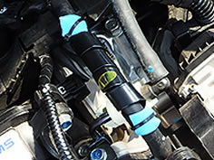 1. 本体の両面テープの紙を剥がし、エンジンのブリーザーホースにらせん状に巻きつけ、結束バンドで固定します。 ※ブリーザーホースがどれかよくわからない場合は、ディーラー等で確認されることをお勧め致します。